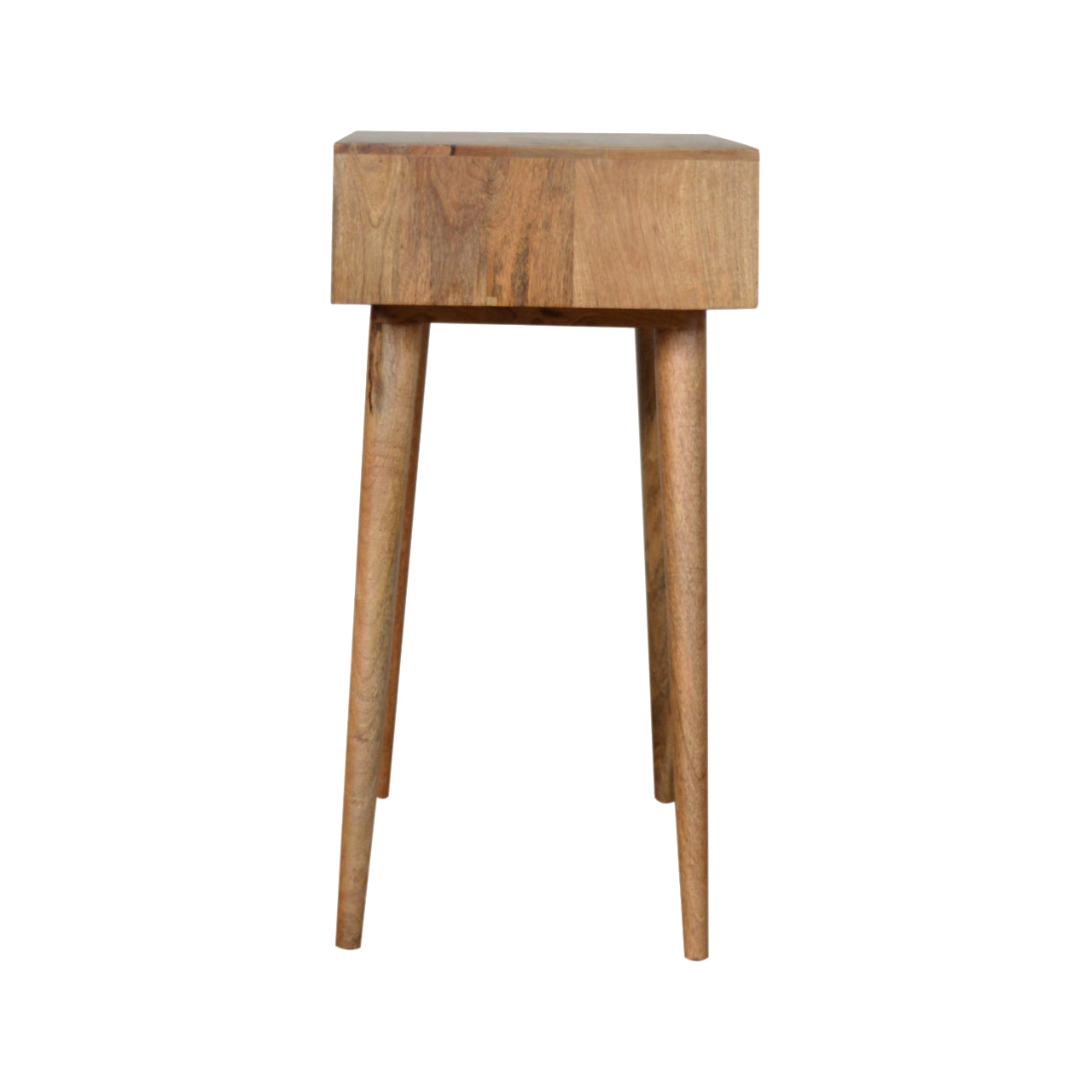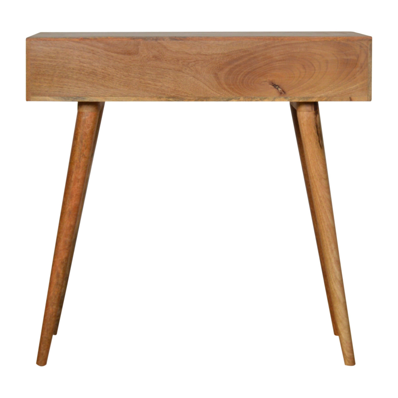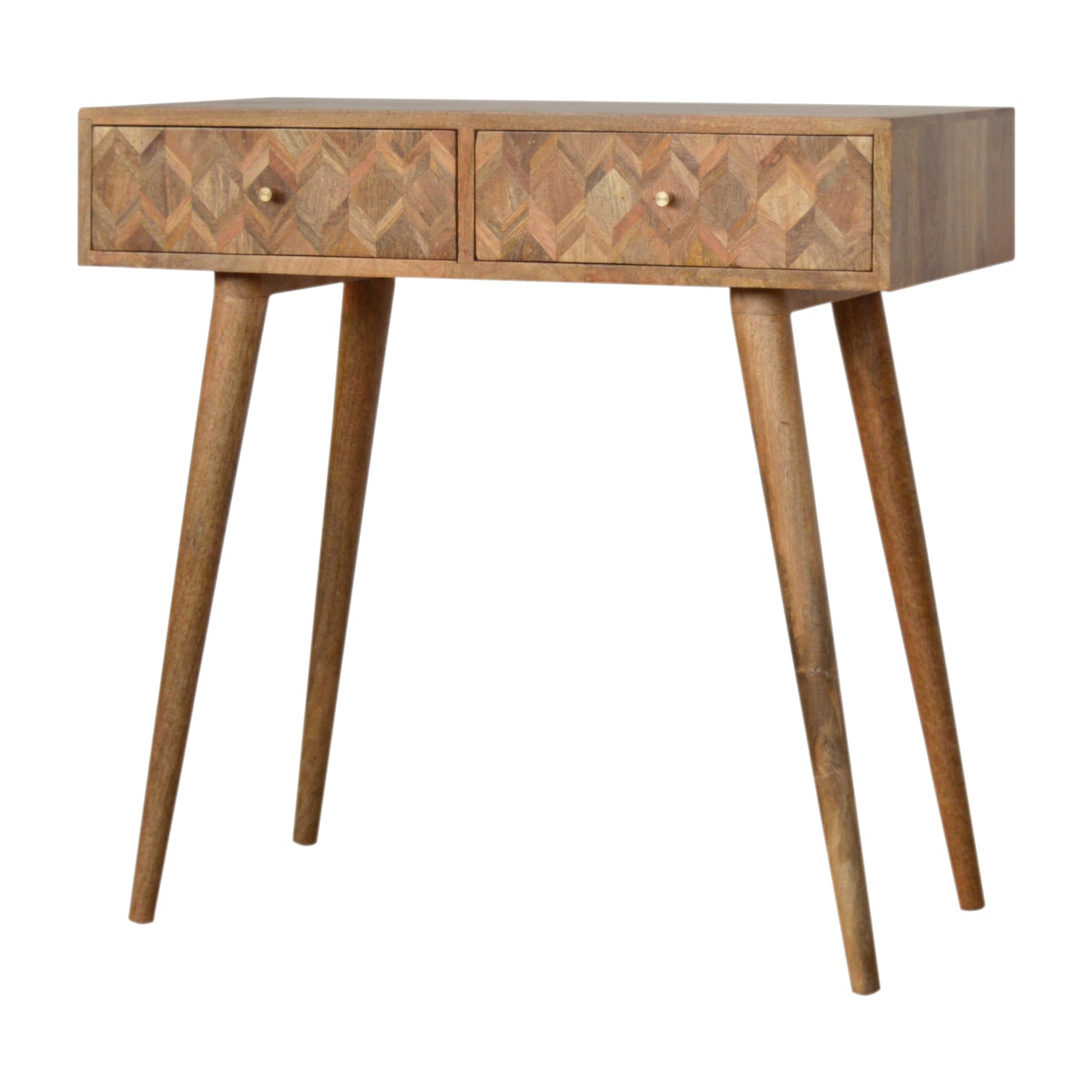 This console table offers a contemporary and versatile style of furniture for today's modern interiors. It has been constructed from 100% solid mango wood in an oak-ish finish and finished with a clear lacquer making the product durable and able to withstand years of use. It has an assorted pattern on the drawer fronts using different bits of wood and 2 candle knobs along with 2 drawers for extra storage. The perfect piece for your living room or hallway.