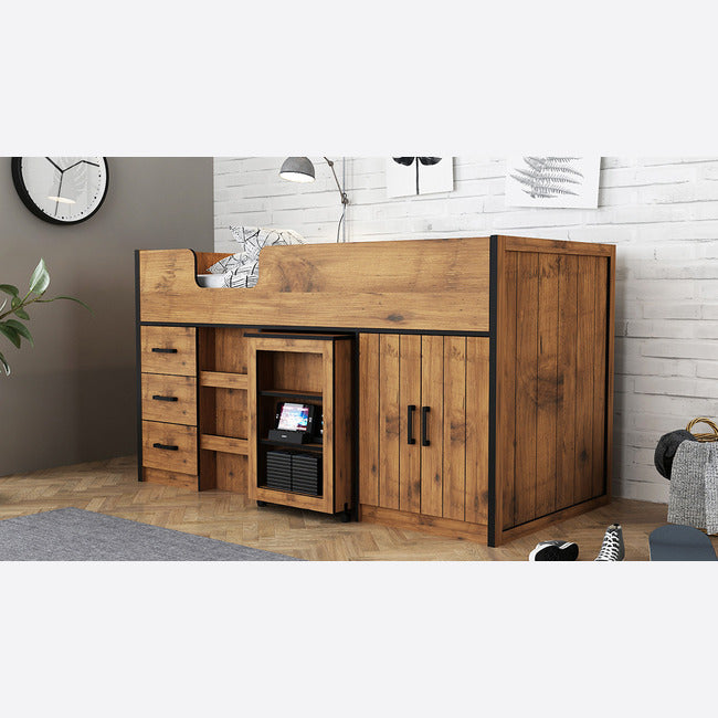 Children's Midsleeper With Pullout Storage Vintage Oak with Black Frame