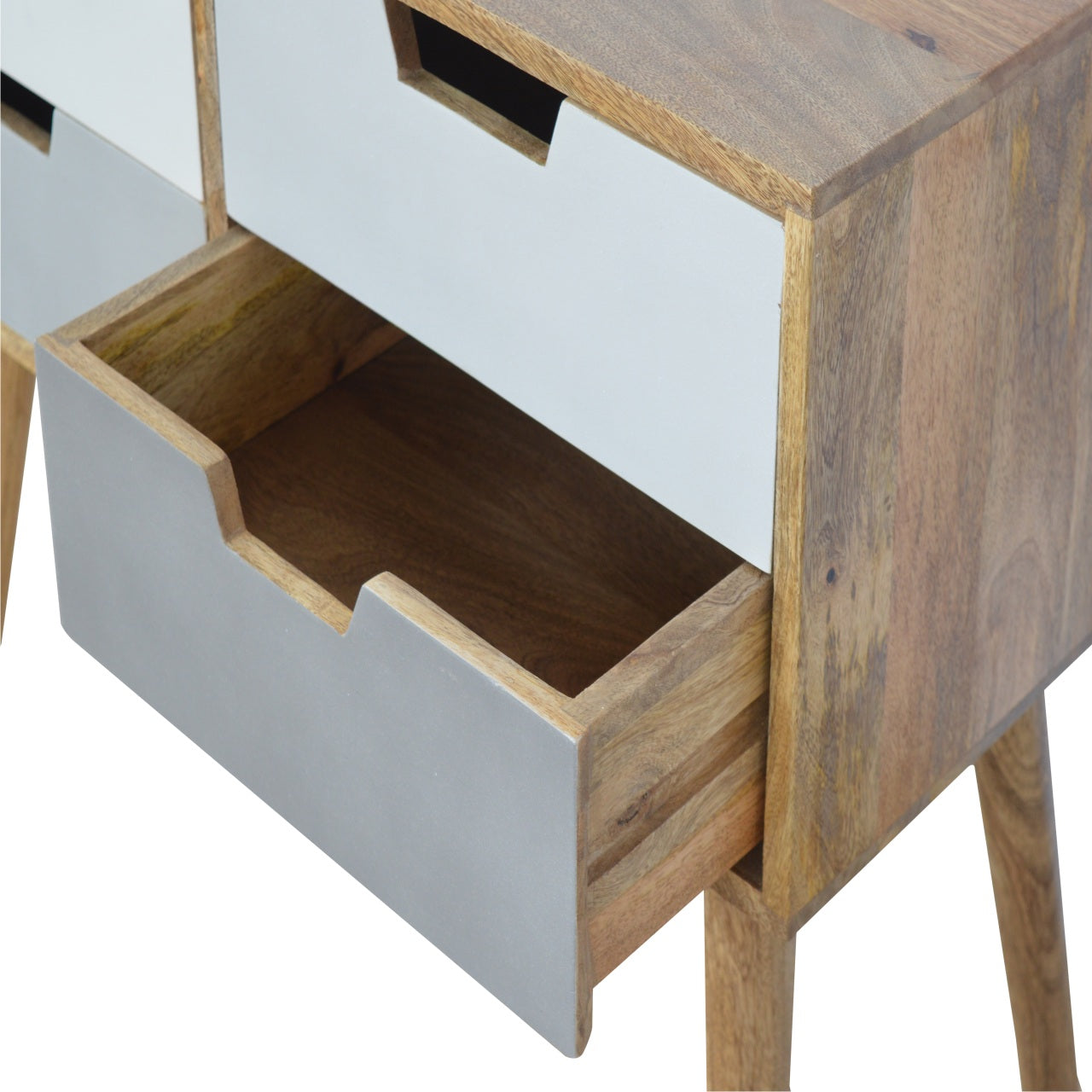 For storing bits like umbrellas, keys, makeup, and everyday essentials this piece of furniture will prove handy all over your home. It is a versatile product that can be suitable for your living area, dining space bedroom, or hallway. It has been constructed from 100% solid mango wood with an oak-ish finish body and 4 cut-out drawers each individually Hand-painted in 4 shades of grey, it is easy as well as practical making it the perfect addition to the home.
