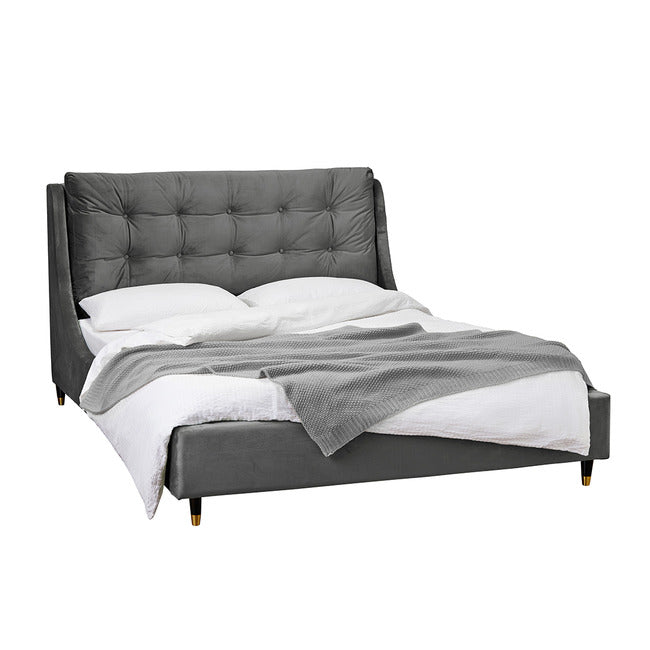 Give your bedroom a first-class design with the beautiful soft and cosy Sloane double bed. Upholstered in a warming plush grey velvet with buttoned detailing, you will never want to get out of bed!