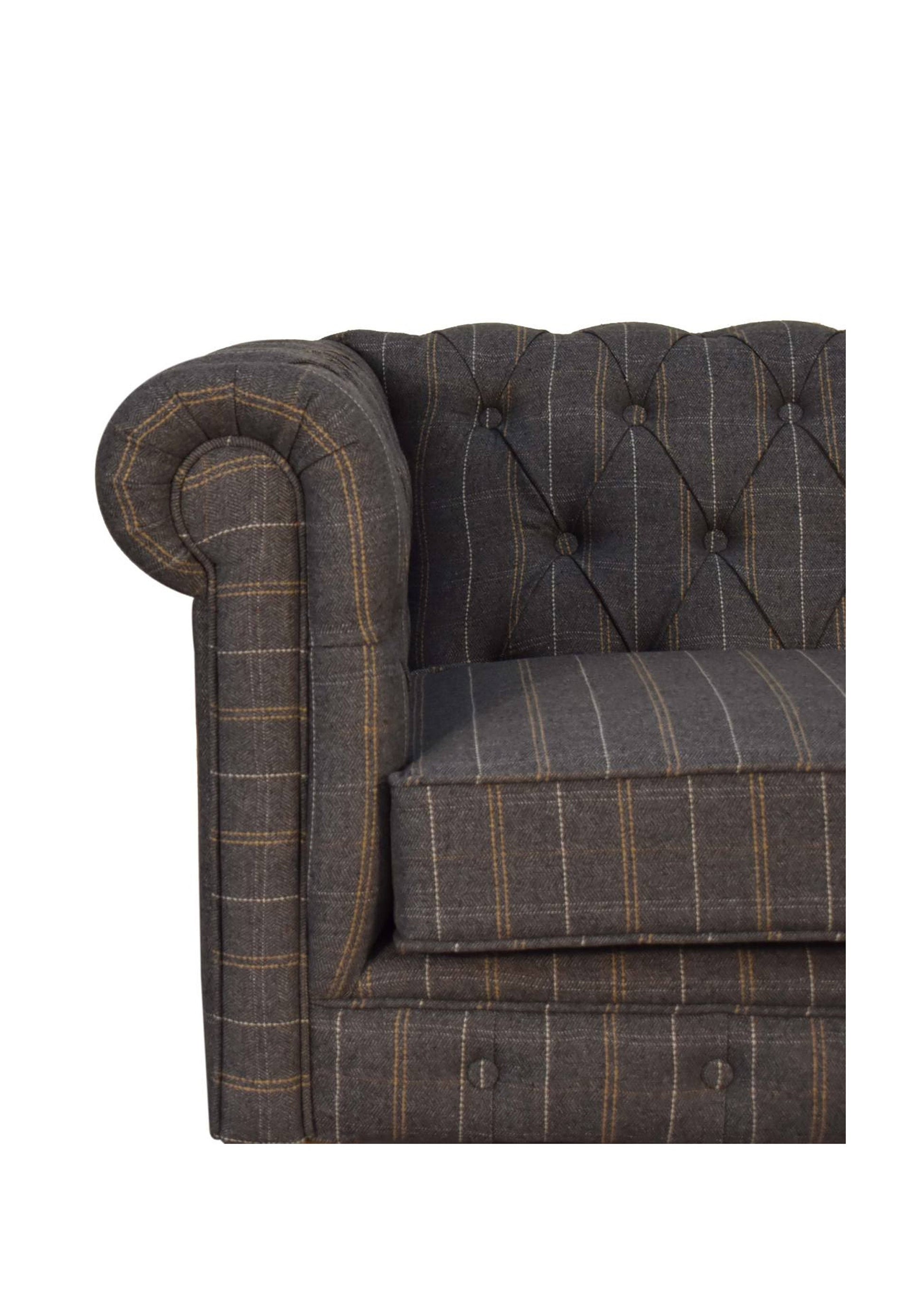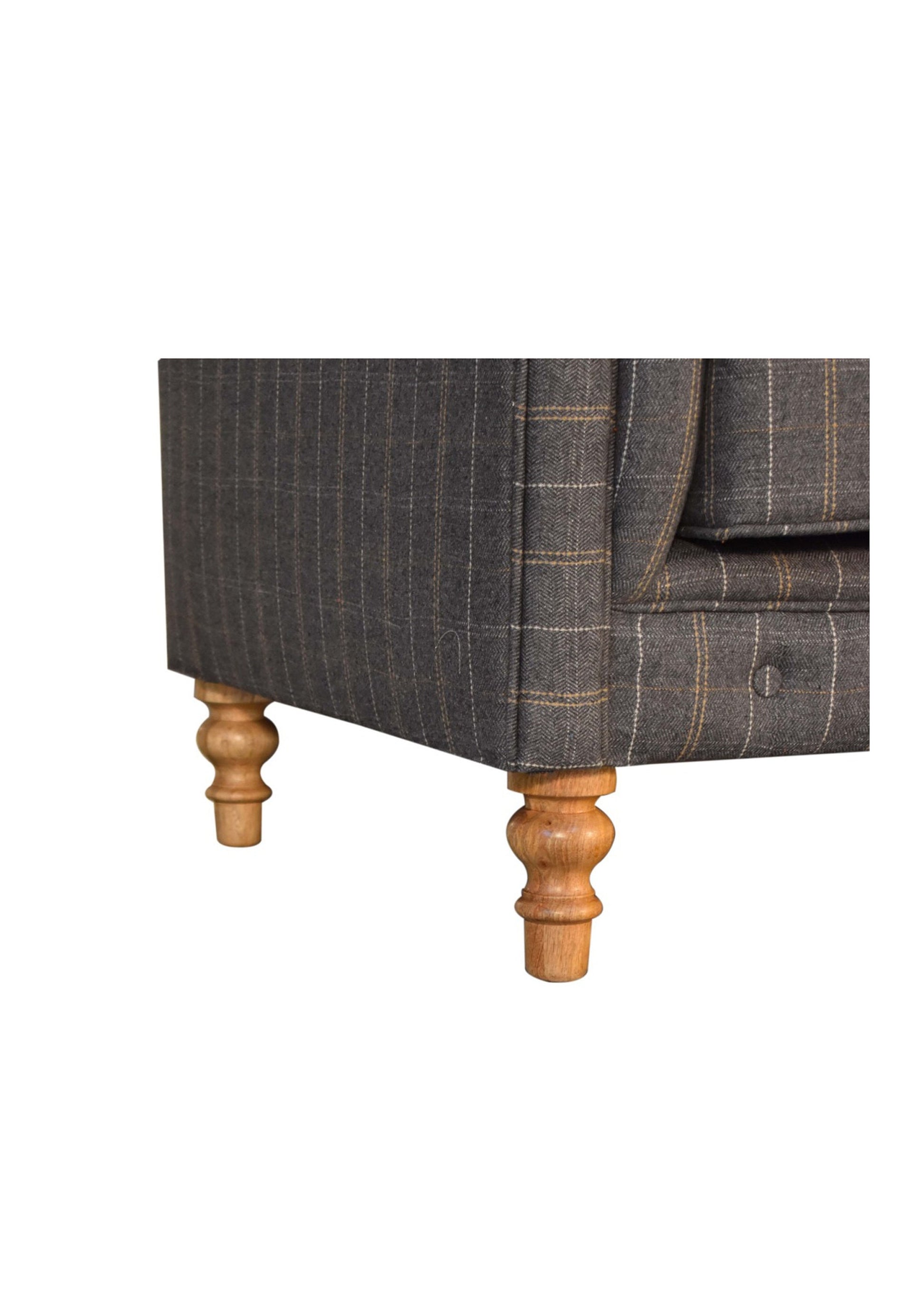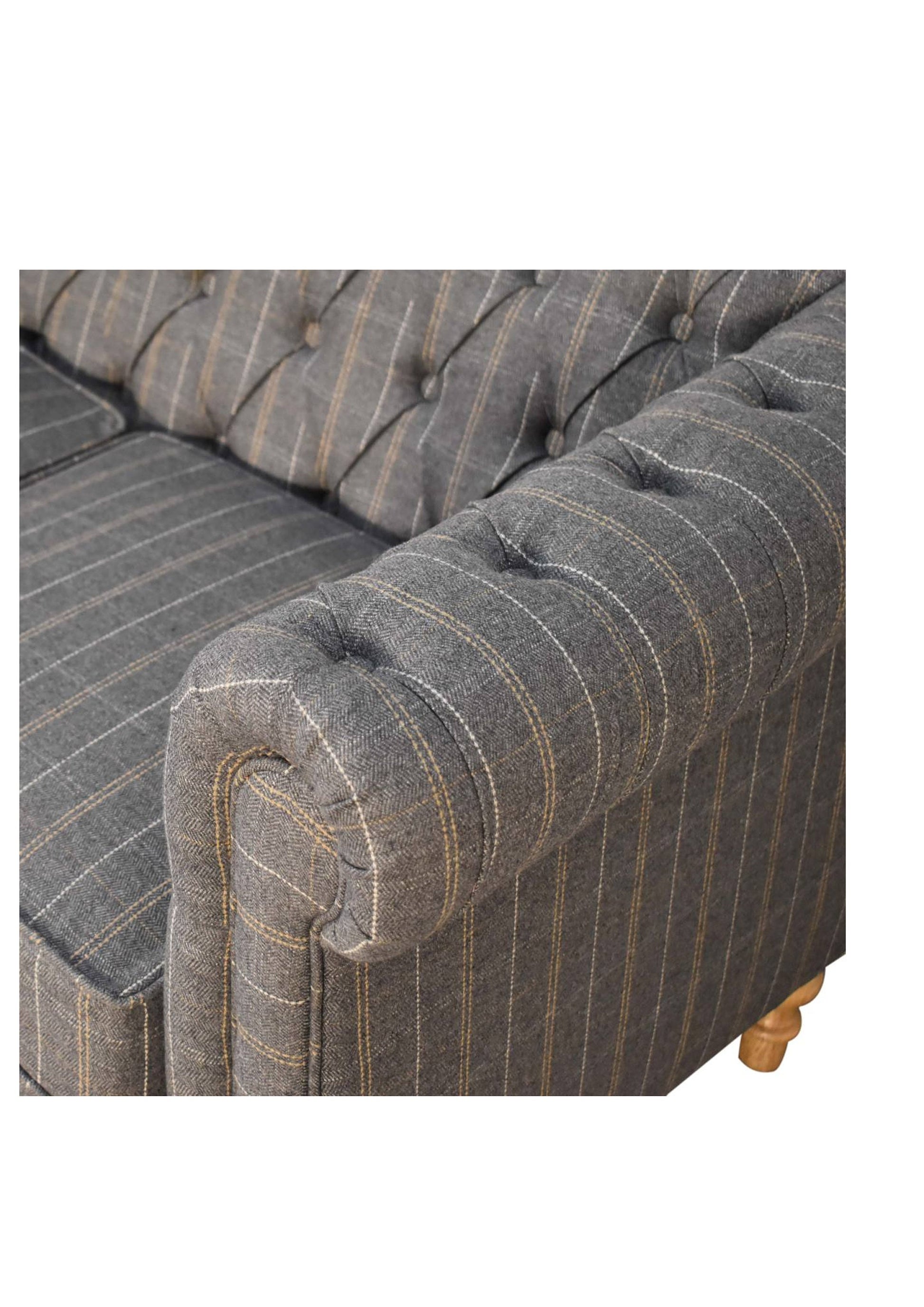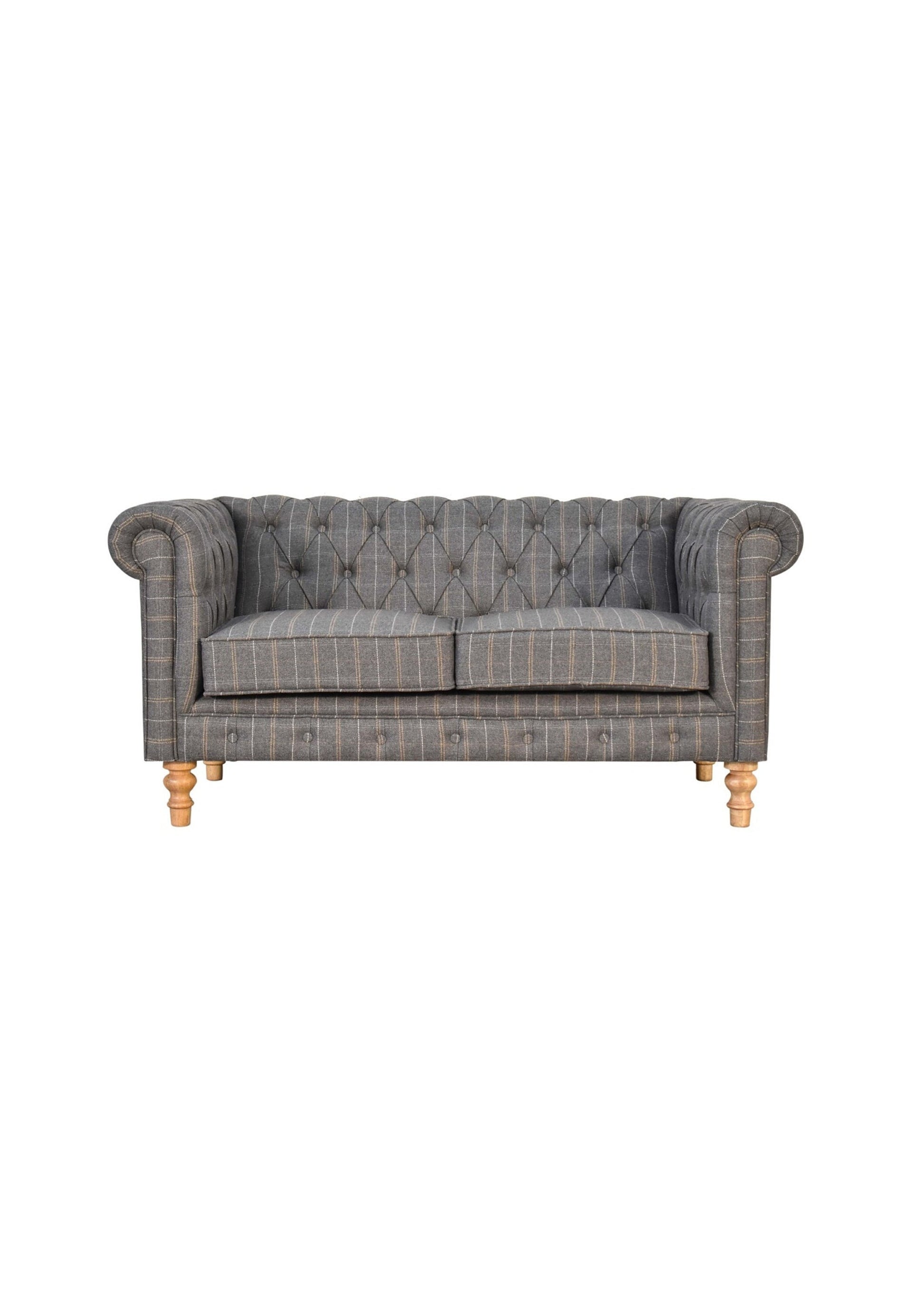 This country style Chesterfield 2 Seater Sofa is fully upholstered in pewter tweed and is constructed from 100% solid mango wood. This 2 seater sofa is detailed with deep button tufts, piping and sheltering arms. It also features hand turned legs which have a fine natural oak-ish finish. You may encounter variations from batch to batch hence if you are looking to pair products under similar room settings; you can opt for a bespoke order or take an informed decision about the possible variations.