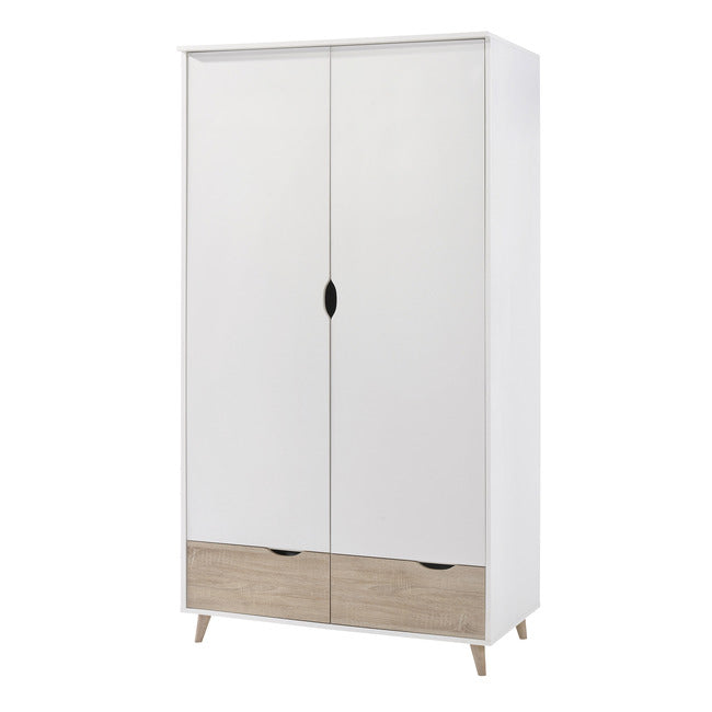 The Stockholm 2 Door Wardrobe is part of the smart look of the Stockholm range. Offered at a very attractive price, the closet is comprised of a matt white finish carcass resting on delicate legs with 2 drawers and 2 doors featuring integral handles. The ever popular oak front detail on the drawers coordinates the wardrobe with the rest of the Stockholm range. Perfect for creating a sleek, retro style, team this piece with the complete bedroom range for a cool and refreshing space.